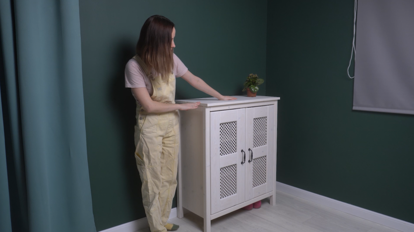 Беру боковину и проверяю где у меня разметка для петель. Это передняя сторона, лицевая. Значит крашеные бруски будут с этой стороны сверху и снизу. С этой стороны будут некрашеные.