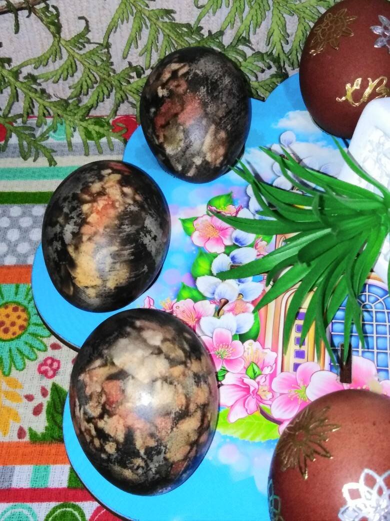 Мраморные пасхальные яйца в каркаде и луковой шелухе