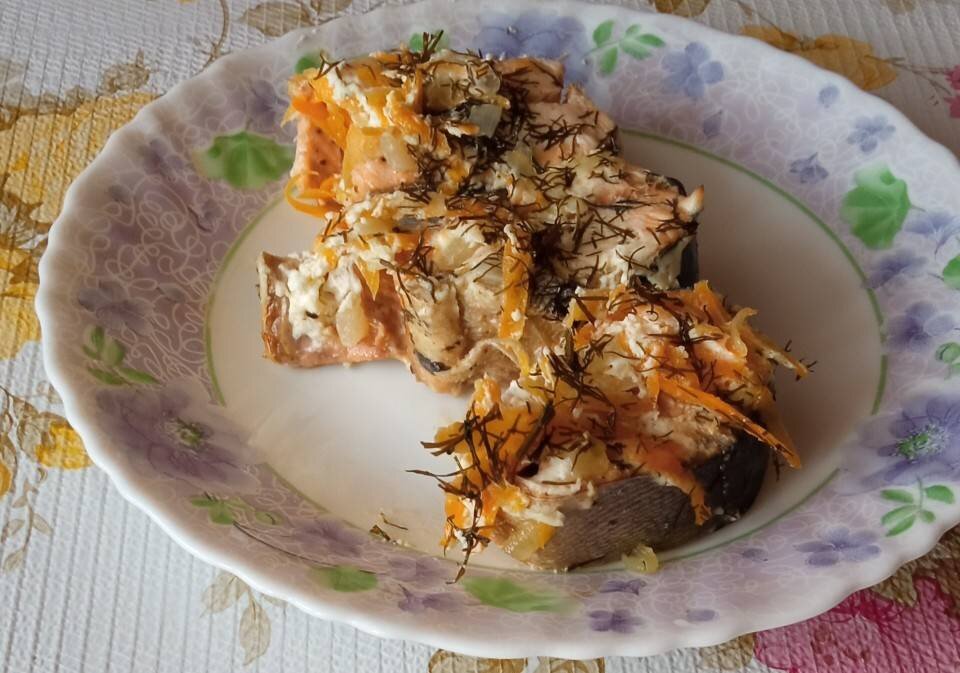 Рыбка по рецепту получается сочная. Ингредиенты: средняя горбуша, пластинки лимона, Специи, морковь , луковица, сметаны Способ приготовления: Рыбу почистить,порезать произвольно. Полить соком лимона, посыпать специями, перчиком, посолить. Пока рыбка отдыхает, делаем зажарку. Морковь на тёрке и лук порезать, перемешать. Поджарить морковь и лук на сковороде. Рыбу переложить в ёмкость для запекания, сверху уложить зажарку, полить всё сметаной, можно посыпать зеленью, сверху накрыть фольгой. Поставить в разогретую до 180 градусов духовку на 25-30 минут. Очень полезно и вкусно!