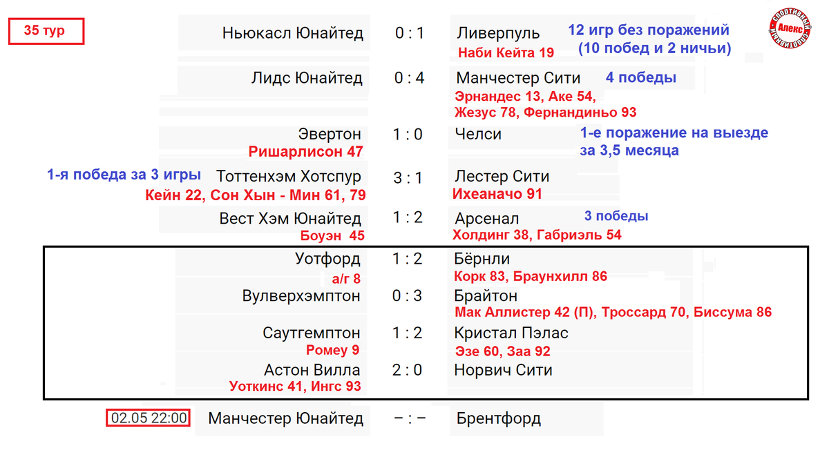 Это результаты чемпионата Англии, расписание и таблица. В конце узнаем ситуацию в других ведущих лигах. Ливерпуль обыграл на выезде Ньюкасл 1:0 и нанёс этой команде 1-е поражение после 4-х побед. Упомянем полузащитника Наби Кейту, который забил первый гол за 3,5 месяца. Беспроигрышная серия Ливерпуля увеличилась до 12 матчей (10 побед и 2 ничьи). Главный конкурент Ливерпуля Манчестер Сити, словно не заметил игры Лиги Чемпионов с Реалом, разгромив Лидс 4:0. Хочу напомнить, что в прошлой игре «горожане» отгрузили этому сопернику 7 сухих мячей. Отметим Жезуса, который отличился в третьем матче кряду, за это время, забив 6 голов. У Фила Фодена – 2 результативные передачи. Манчестер Сити выиграл 4-ю игру подряд. Следующий ТОПовый клуб отправился в гости к Эвертону и проиграл. Челси и в первом круге потерял очки, сыграв дома вничью. Челси потерпел первое поражение на выезде за 3,5 месяца. Последний раз их обыгрывал на своём поле Манчестер Сити. Тоттенхэм выиграл у Лестера 3:1 и одержал пе