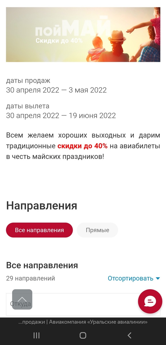 Распродажа до 40% у Уральских авиалиний — на баннере написано "пойМАЙ" - так что видимо не везде 40% и не на все направления) → https://www.uralairlines.ru/sales/salemay/all/ Смотрите свои города вылетов 👍