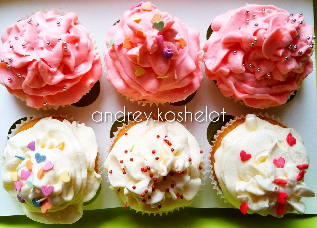5. В эту же емкость просеиваем муку и всыпаем разрыхлитель, снова тщательно перемешиваем. 6. Получившееся тесто разливаем по бумажным или силиконовым формочкам и ставим в разогретую духовку на 20 мин при температуре 180°. 7. Достаем из духовки и даем полностью остыть. В это время можно приготовить