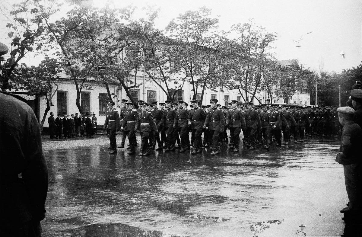 Друзья, мы отправляемся в 1962 год и посмотрим на движение участников парада - Ленинского училища и колонны ДОСААФ, включая гоночные автомобили, которые после парада продолжают движение по улицам Ташкента.