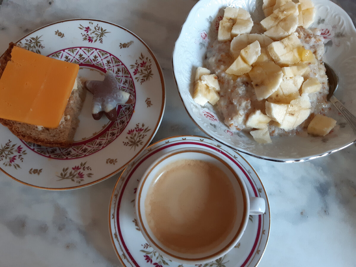завтракаем сегодня кашей. Сварила пшеничную с ячневой в смеси (т.к. пшеничная была на исходе уже) на молоке (одно название, на самом деле, молока 1/4 часть примерно), добавила изюм и банан. Сахара совсем не добавляли в кашу. Бутерброды с сыром, по конфетке к кофе и чаю