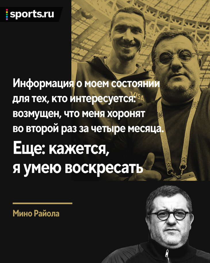 В четверг футбольное медиаполе содрогнула новость: умер 54-летний Мино Райола. Про смерть одного из самых известных и влиятельных агентов современности написал авторитетный инсайдер Танкреди Палмери. Позже Мино и его окружение новость резко опровергли Всего через пару часов в твиттере самого Райолы появился ироничный пост: «Информация о моем состоянии для тех, кто интересуется: возмущен, что меня хоронят во второй раз за четыре месяца. Кажется, я умею воскресать». Сегодня Райолы не стало – на этот раз информацию о смерти агента принес его адвокат. Через пару минут в твиттере Райолы появилось сообщение от семьи: «С большим прискорбием сообщаем, что скончался самый заботливый и невероятный футбольный агент из всех когда-либо живших. Мино боролся до самого конца с тем же усердием, которое он вкладывал в переговорные процессы, защищая своих футболистов. Работа Мино затронула жизни стольких людей, он написал новую главу в современной истории футбола. Мы всегда будем скучать по нему. Миссия