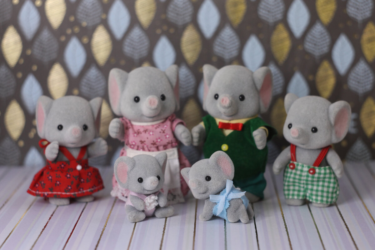 1. Семейка слонов старая 3558 + 3560. Не хватает Elephant Baby 3559. Этот набор я нашла сначала в виде выпуска для англии с хватательными лапками, мне показалось дорого и я не купила. Но потом дважды покупала с рук обычные наборы. Первый раз какой попался, второй — более полный и в лучшем состоянии. Также у меня есть семейка современных слонов, голубого цвета без покраски ушей и носов, но она не распакована.