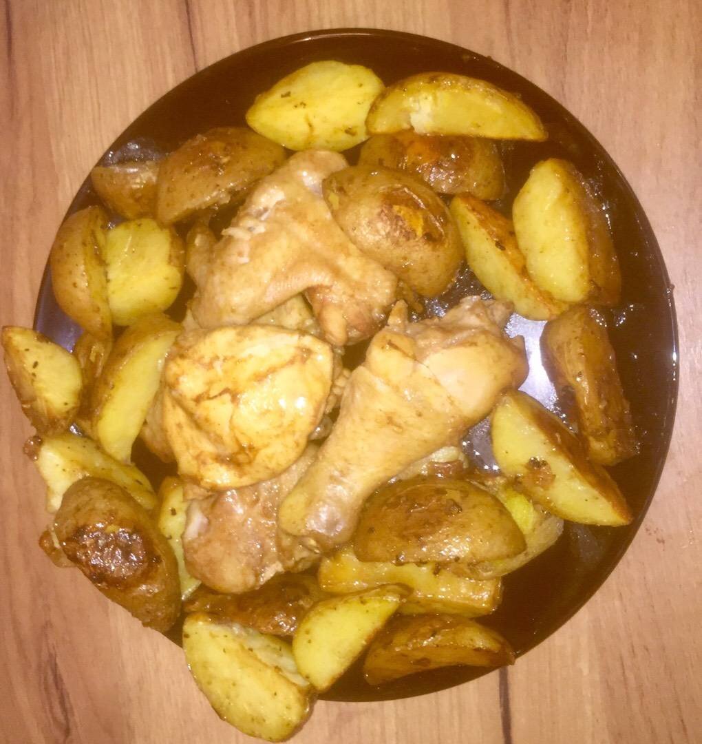 Ингредиенты: картошки, курицы (у меня крылья, голени и грудка), чеснока, майонеза, Смесь специй для мяса, Сухой чеснок, Соль, Подсолнечное масло Способ приготовления: Мясо посолить, добавить специи для мяса, сухой чеснок, ложку майонеза. Оставить мариноваться на полчаса. Картошку вымыть, разрезать на 4-5 частей. Посолить, добавить немного тех же специй (для мяса у меня), измельчённый чеснок, ложку подсолнечного масла и ложку майонеза. Мясо выложить на фольгу на решетку. Вторым краем фольги накрыть сверху и хорошо запечатать края фольги. Картошку выложить на смазанный подсолнечным маслом противень. Отправить в разогретую до 180-200 градусов духовку на 50-60 минут. Картошку я перевернула, где-то через 20 минут, потом ещё минут через 10. Мясо через 30-40 минут открыть, чтобы подрумянилось.
