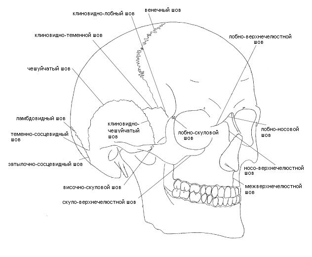Швы черепа Особые неподвижные соединения костей - швы - встречаются только между костями черепа. До рождения швы подвижны, и кости черепа плода настолько мягки, что могут раздвигаться по мере увеличения размеров мзга. Даже после рождения кости ребёнка остаются более мягкими, чем у взрослого, поэтому и в передней, и в задней части черепа можно найти упругие участки. Эти так называемые "роднички" представленны хрящевыми мембранами, образующими промежутки между растущими костями черепа. К 18 месяцам размеры мозга ребёнка почти такие же, как у взрослого, и кости черепа затвердевают. Швы не видны сквозь кожу, а роднички закрываются. * На мой взгляд самая простая и информативная картинка.
