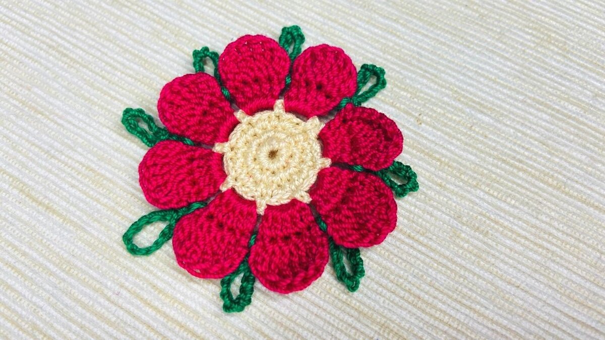 Мастер-класс по вязанию крючком цветка с 8 лепестками и зелеными листиками.