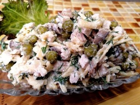 Всем доброго утра! Давайте сегодня приготовим салат "Аппетитный". Нам понадобится. Филе куриной грудки - 1 штука (20-250 грамм); Грибы маринованные - 100 грамм (любые); Банка зеленого горошка - небольшая Сыр твердый - 200 грамм Сметана - 100 грамм Хрен - 50 грамм. Укроп, соль, перец по вкусу. Приступим. 1. Филе отварить в подсоленной воде , остудить и нарезать мелким кубиком. Сложить в глубокую миску. 2. Маринованные грибы промыть, порезать также кубиком и добавить в миску 3. Сыр натереть на крупной терке и тоже с миску. 4. Зеленый горошек сливаем и добавляем в миску. 5. Сметану и хрен в миску. 6. Добавляем мелко порезанный укроп и соль (по необходимости). Все аккуратно перемешиваем. 7. Салат готов. Приятного аппетита. Попробуйте, этот салат очень сытный и пикантный. А теперь краткий ролик по приготовлению. Не забывайте подписываться на мой канал. До встречи !!!