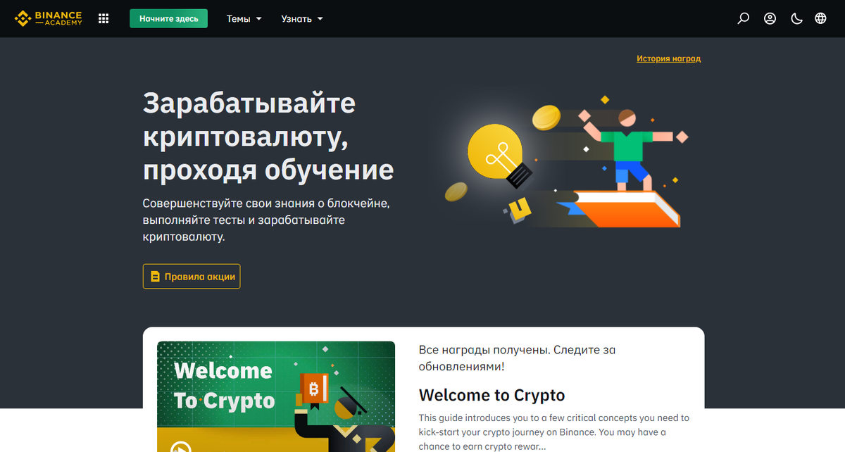 Всем привет. Хотел бы поделиться информацией, как можно приобрести немного крипты, не потратив на это ни копейки! Итак, погнали. Одной из самых распространенных криптовалютных бирж является биржа Binance. Binance – криптовалютная биржа, основанная в Китае. Основная ее задача – сделать доступной торговлю цифровыми активами, чаще всего это биткоин. Штаб-квартира расположена в Шанхае. Биржа входит в рейтинг пятерки лучших криптобирж на рынке, топ-3 платформ по суточному объему торгов. Здесь осуществляется более 1 400 000 транзакций в секунду. Ну так вот. Помимо того, что вы можете приобретать и торговать на ней криптой, там можно получать монеты за прохождение каких-либо заданий. Бинанс богат разными акциями и бонусами, но за ними нужно следить в разделе “Центр поддержки” во вкладке “Объявления”. Также здесь часто запускаются промоакции и временные бонусы за отдельные операции в кошельках. Помимо всего этого, на бирже есть раздел «Учись и зарабатывай», в котором можно, пройдя небольшое об