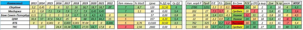 Добрый день, товарищи инвесторы. Продолжаем тему «дивидендных аристократов» РФ, сегодня разберем несколько компаний из финансового сектора. 💡Количество лет повышения дивидендов – самый важный критерий в данной таблице. Лидеры в секторе: Сбербанк, Московская биржа – 7 лет, БСП – 6 лет, Киви, ВТБ – 5 лет, ТКС (Тинькофф) – 3 года. 💡Доля компаний в индексе Мосбиржи. Самый высокий процент у Сбербанка, а учитывая прив. акции процент вообще в районе 9,5. БСП и Киви в индекс не входят. 💡Исходя из цены акции и прогнозных дивидендов ( в графе 2022) рассчитывается дивидендная доходность (% ДД пр - Прогнозная). Да, здесь есть высокие значения, но на дивиденды в этом году рассчитывать не приходится. Сбербанк – есть риск снижения, переноса или отмены. ВТБ – скорее всего не будут платить. Прогнозы по дивидендам в этом секторе уже не актуальны. 💡Средняя ДД за 5 лет. Самые высокие показатели у Сбербанка, Киви и Мосбиржи. 💡Капитализация компании в млрд рублей. Чем больше компания, тем она у