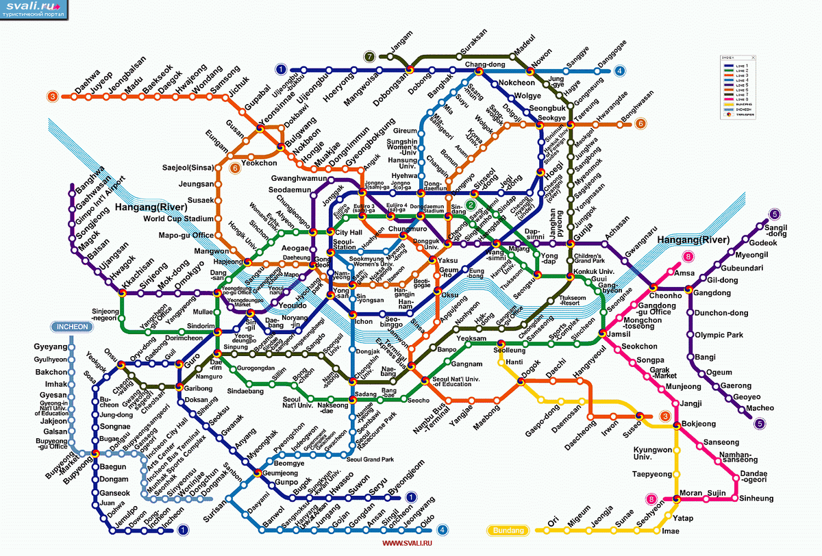 Сеул - столица Южной Кореи, с населением более 9млн жителей. Метрополитен хорошо развит, можно перемещаться между городами. Например, приехать из Инчхон, где расположен аэропорт, в сам Сеул. Карта метрополитена будет не привычна для жителей Москвы и Санкт- Петербурга, но интуитивно она понятна. Ветки располагаются на разных уровнях, совершать переход с ветки на ветку удобно и не занимает много времени.