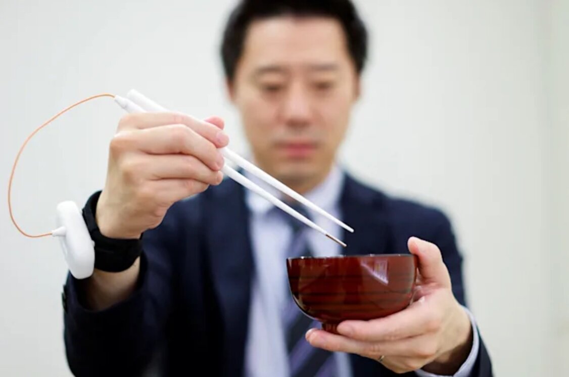 Японские исследователи разработали электронные палочки для еды, которые манипулируют ионами натрия, усиливая соленый и сладкий вкус пищи. Поваренная соль необходима человеку из-за наличия важных химических элементов, но лишь в незначительных количествах. Поскольку при добавлении к продуктам питания она хорошо усиливает и другие ароматы, то зачастую люди потребляют ее больше чем нужно, что может навредить. Переизбыток натрия вызывает задержку жидкости в организме, вследствие чего может повышаться кровяное давление, возникать разнообразные заболевания сердца, почек, желудка, остеопороз и катаракта. Для Японии это особенно актуально, поскольку традиционному местному рациону присущи более соленые вкусы. В качестве решения проблемы компания Kirin совместно с учеными из Университета Мэйдзи решила создать прибор, «обманывающий» определенные вкусовые рецепторы. В результате они создали набор электронные палочек для еды, которые усиливают восприятие ионов натрия. Палочки связаны между собой, а