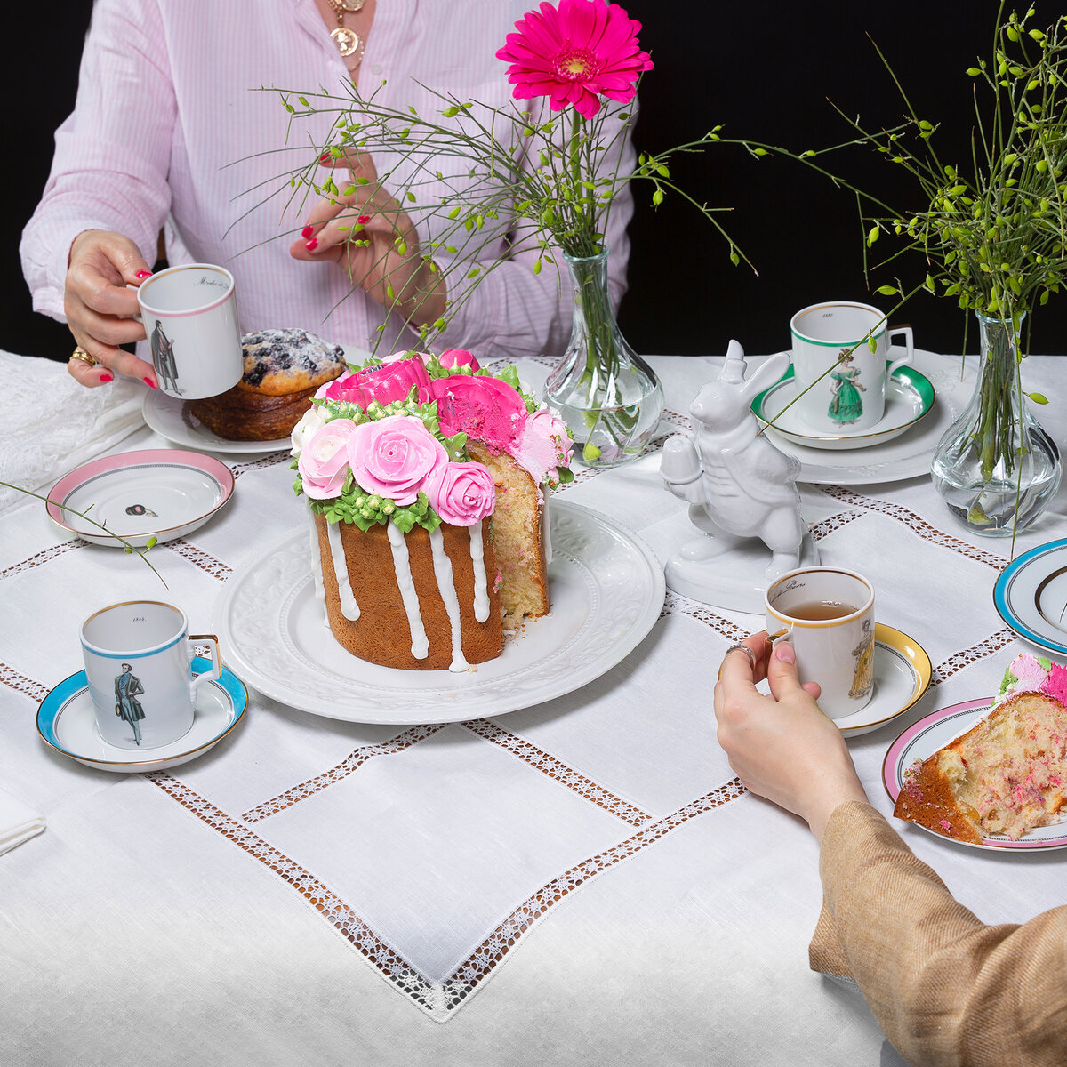 Пасха — праздник яркий, многоцветный, радостный, весенний. Палитра праздничного декора традиционно щедра, насыщенна, после зимы особенно хочется света и цвета. На пасхальном столе не может быть слишком много красок — смело доставайте самую яркую посуду, цветной хрусталь, расписные керамические фигурки — все будет смотреться уместно и празднично! Тон радостной симфонии красок задают главные пасхальные угощения — расписные яйца и украшенные цветной глазурью куличи. Чтобы подчеркнуть яркие цвета, поставьте эти символы Пасхи на белые блюда. Прочая посуда может быть самой многоцветной: нарядный фарфор, колоритная майолика, цветное стекло, нетускнеющая финифть. Пасха — это тот день, когда на стол незазорно поставить «все лучше сразу». Чудесно будет смотреться на праздничном столе и декор из расписной глиняной игрушки, например, сказочные дымковские птицы, милые лошадки, колоритные барышни. И самое главное — используйте белую льняную скатерть как полотно художника. Изделия наших народных про
