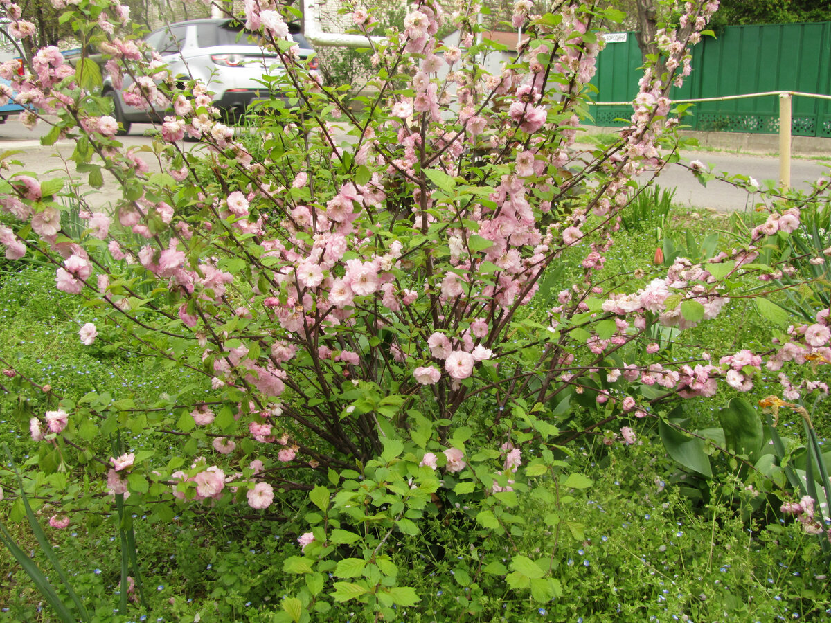 Весной город украшают красиво цветущие кустарники. Одним из первых распускается форзиция и радует глаза желтыми цветами. Одним из замечательных красивых цветущих кустарников является миндаль декоративный, его розовые махровые цветы выделяются на зеленом фоне газонов. Не менее нарядно выглядит цветущая керия японская, в ту пору, когда плодовые деревья уже отцвели, этот кустарник долго остаётся в цвету. Керия японская цветет 2 раза в год. Второй раз она зацветает, когда спадет жара, осенью. Особого ухода керия не требует, только нужно обязательно обрезать летом разрастающиеся кусты. Среди тюльпанов любит и котейка посидеть, и погреться на солнышке. Осенью нужно не забывать посадить луковицы тюльпанов, чтобы весной они нас радовали. Всем спасибо за прочтение!