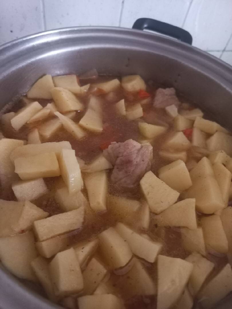 Ингредиенты: Свинина , Репчатый лук крупный , Морковь , Картофель , Растительное масло , Лавровый лист , Черный перец горошек , Соль , Вода , Томатная паста , Чеснок Способ приготовления: Свинину я промыла, обсушила бумажными полотенцами и нарезала средними кусочками — 4 х 4 см. Выложила их на сильно разогретую сухую сковороду (если мясо постное, без жирка, то можно подлить масла). Обжаривала на сильном огне, обязательно без крышки, чтобы мясо со всех сторон быстро схватилось корочкой. Таким образом мы «запечатаем» внутри каждого кусочка все соки, они будут удерживаться внутри при тушении, а значит, свинина получится сочной и мягкой. В самом конце приготовления присыпала жареное мясо солью, перцем, несколько секунд прогрела, чтобы раскрылся аромат специй. Далее добавила в сковороду лук и морковь, обжарила их, нарезанные средним кубиком. Как только овощи подрумянились, отправила их в кастрюлю. В сковороду влила примерно пол-литра воды, добавила немного соли, лавровый лист и пару горошин