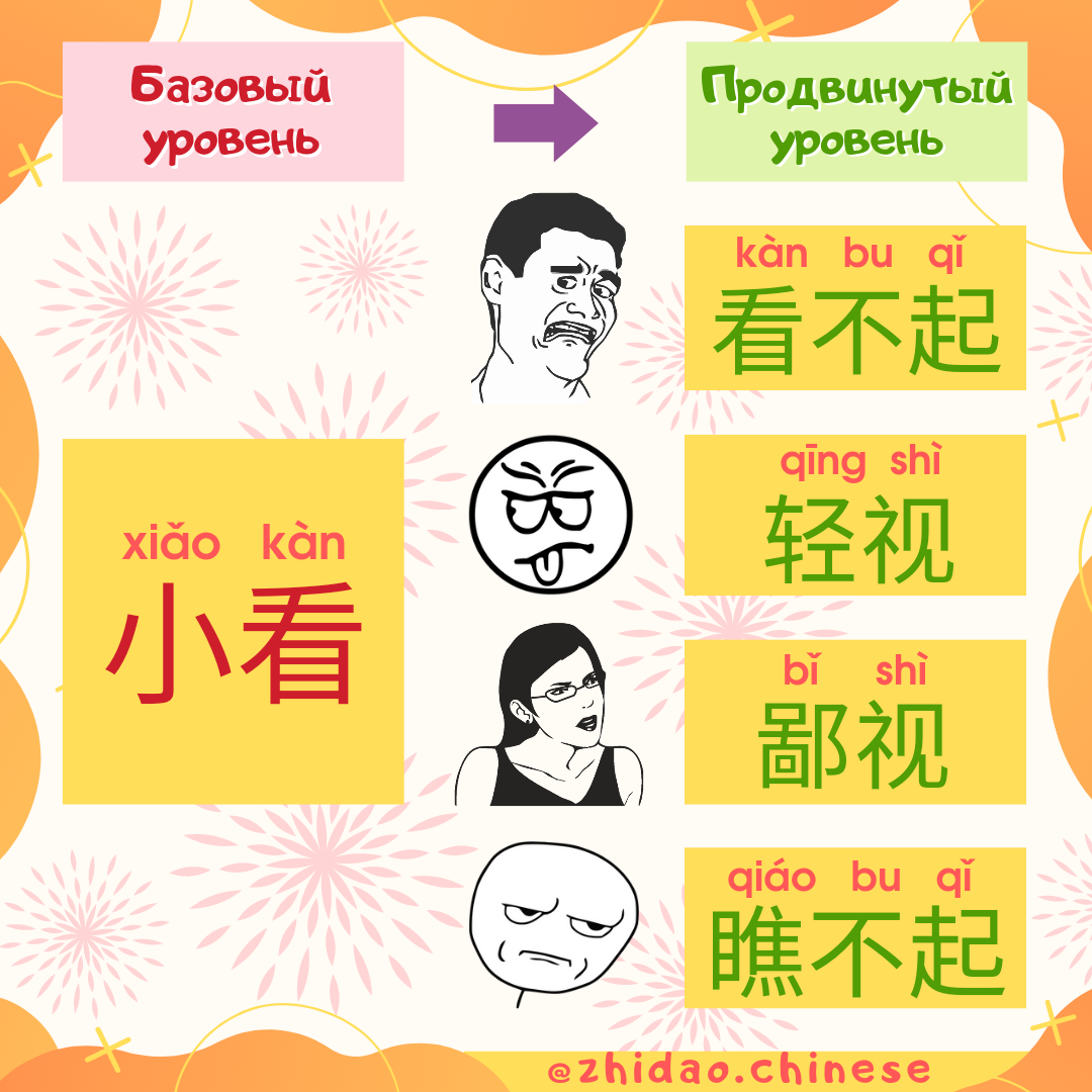#zhidao_синонимы Сегодня делимся с вами словами для выражения презрения на китайском языке 😈👎 🔊 Открывайте видео и включайте звук, чтобы услышать, как произносится каждое слово! 🔸小看 xiǎokàn презирать, игнорировать 🔸看不起 kànbuqǐ смотреть свысока (на кого-либо), относиться с пренебрежением 🔸轻视 qīngshì пренебрегать, недооценивать, относиться несерьёзно, принижать значимость 🔸鄙视 bǐshì смотреть свысока, пренебрежительно смотреть 🔸瞧不起 qiáobuqǐ глядеть сверху вниз, относиться с презрением И примеры с новыми словами: 🔹不要小看任何一个对手。 Bú yào xiǎo kàn rènhé yí gè duìshǒu Не стоит недооценивать любого противника 🔹懒汉总叫人看不起。 Lǎnhàn zǒng jiào rén kànbùqǐ На ленивых всегда смотрят свысока 🔹不要轻视发音哦。 Bú yào qīngshì fāyīn Не относитесь к произношению легкомысленно 🔹他十分鄙视无礼行为。 Tā shífēn bǐshì wú lǐ xíngwéi Он крайне презирает неуважительное поведение 🔹不要瞧不起妇女的作用。 Bú yào qiáobuqǐ fùnǚ de zuòyòng Нельзя недооценивать роль женщин 📝 Ссылка на карточки Quizlet для изучения новых слов: htt