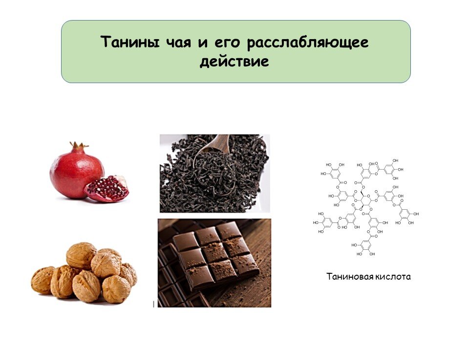 Танин – аминокислота, которая преимущественно содержится в чае, именно благодаря данному веществу чай обладает расслабляющим действием. Также танины содержатся в незрелых фруктах, вине, гранате, шоколаде, орехах (рис.1). Чувство терпкости и вяжущие свойства как раз вызывают танины. Согласно исследованию L. Juneja танин в количестве от 50 до 200 мг оказывает расслабляющее действие, но при этом не вызывает сонного состояния [1].