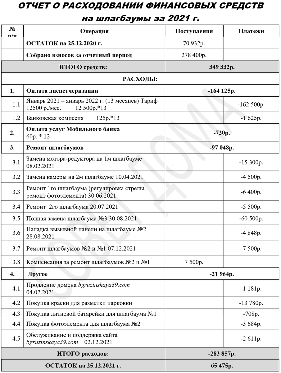 Отчет о расходовании финансовых средств на шлагбаумы за 2021 год