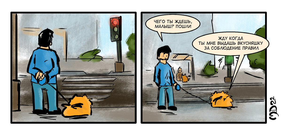 Во время наших прогулок мы очень часто переходим с псом дорогу и он давно уже разобрался в принципах работы светофора и переходам по зебре, но привычка получать вкусняшку за ожидание зеленого света никуда не делась, потому он очень часто продолжает сидеть на месте, пока не получит ее.