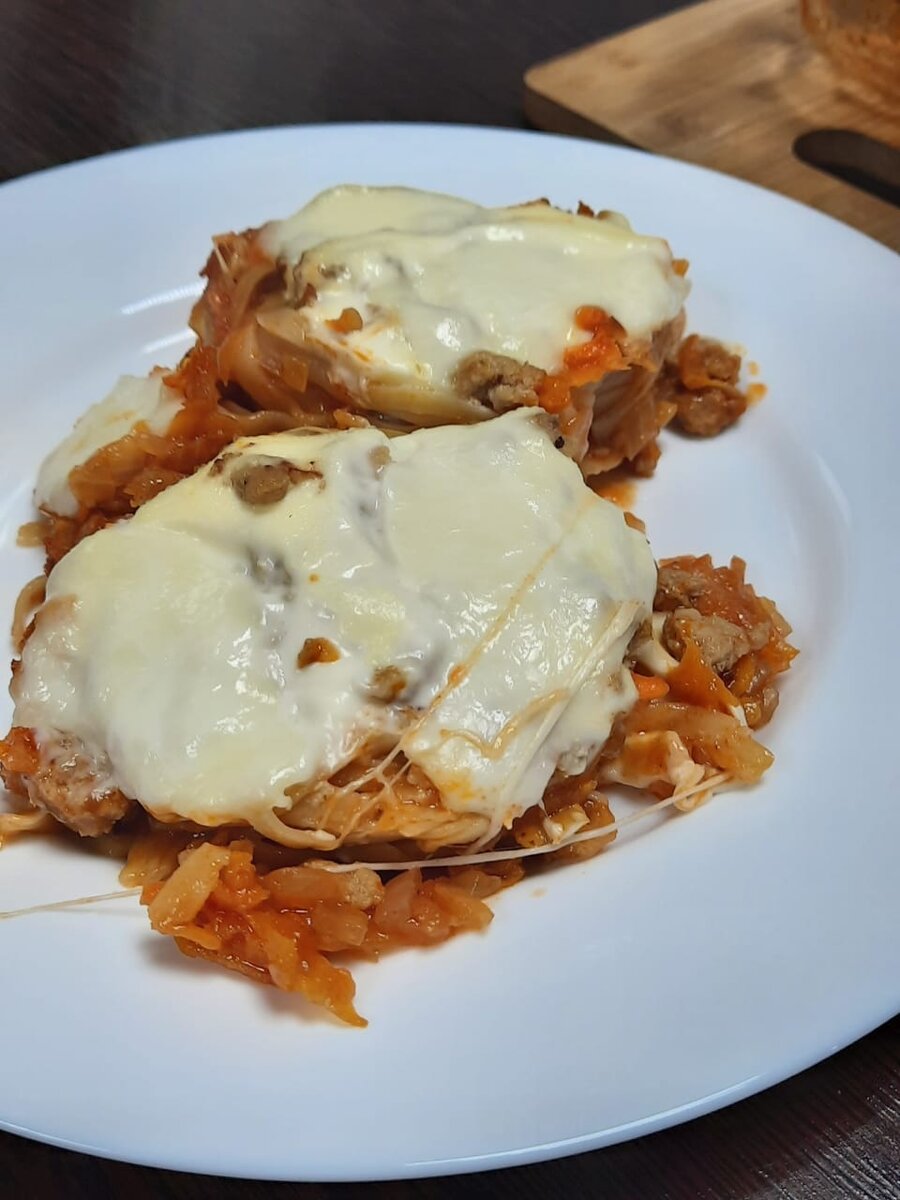 6. Моцарелла 120г (любой другой сыр) Приготовление: 1. Опускаем макароны в слегка подсоленную кипящую воду и варим примерно 2 минуты. Этого времени будет достаточно для того, чтобы они стали немного мягкими. 2. Нарезаем небольшими кусочками репчатый лук, натираем морковь и обжариваем овощи на растительном масле до золотистой корочки. После этого добавляем к ним томатную пасту и тушим в течение нескольких минут. По желанию можно добавить немного сметаны. Тонкой струйкой приливаем 200мл горячей воды, доводим до кипения, добавляем соль, специи по вкусу и снимаем соус с огня. 3. Выкладываем макароны в форму для выпекания и распределяем в серединку фарш. Его я предварительно обжарила, но можно использовать сыр