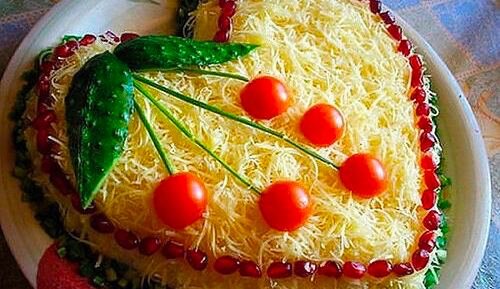 ИНГРЕДИЕНТЫ: ▫️1 куриная грудка; ▫️1 крупная луковицы; ▫️130 г твердого сыра; ▫️4 яйца; ▫️350 г помидоров черри; ▫️майонез по вкусу. ПРИГОТОВЛЕНИЕ: 1. Куриную грудку отварите до готовности (примерно 30 минут с момента закипания), остудите и нарежьте на не небольшие кубики. 2. Яйца отварите вкрутую, остудите, очистите и порежьте на мелкие кубиками. 3. Лук порежьте мелкими кубиками, обжарьте на растительном масле, пока он не станет прозрачным, дождитесь, пока лук стынет. 4. На плоское блюдо и тарелку поставьте бортики от разъемной формы в виде сердца и выкладывайте слоями: чуть-чуть майонеза, кусочки курицы, лук, снова майонез, яйца, майонез, тертый сыр. 5. Украсьте салат половинками помидоров черри. 6. Дайте салату постоять в холодильнике, снимите бортики, после чего украсьте зеленью, имитируя веточки вишенок. ПРИЯТНОГО АППЕТИТА ВАМ!!! #салаты рецепты #вкусный салат #праздничный салат