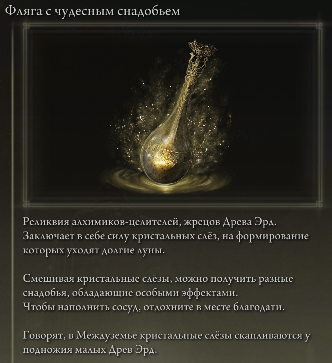Фляга с чудесным снадобьем (Фляга) – позволяет смешивать кристальные слёзы получая снадобье, выпив которое персонаж получает баф на 3 минуты. Снадобье можно выпить 1 раз. Сосуд наполняется повторно после отдыха в месте благодати. Фляга находится на востоке Замогилья в «Третьем храме Марики.