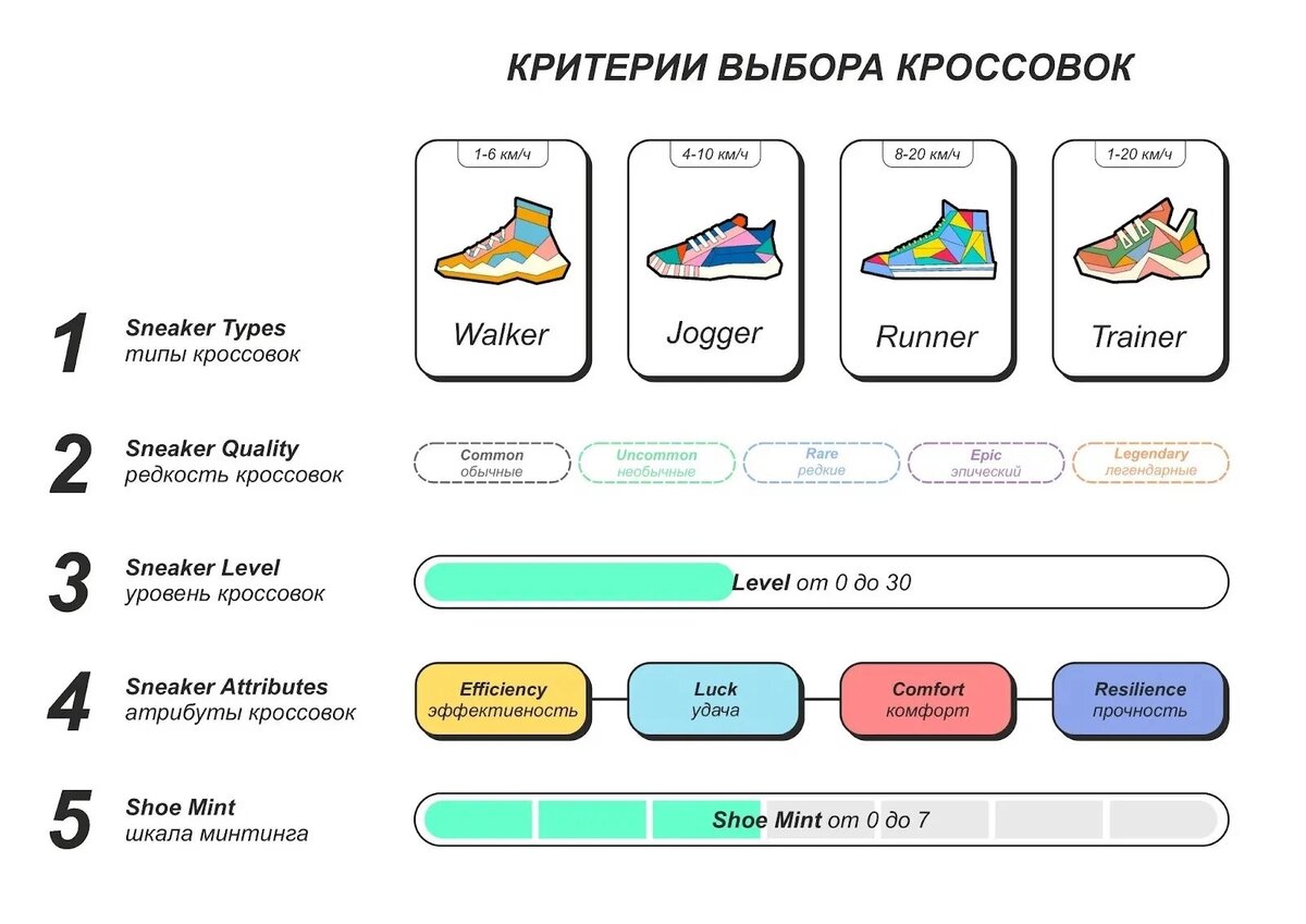 В приложение присутствуют 4 типа кроссовок: Walker, Jogger, Runner, Trainer. Приобрести их можно на внутреннем рынке в приложение или на маркетплейсе Magic Eden.