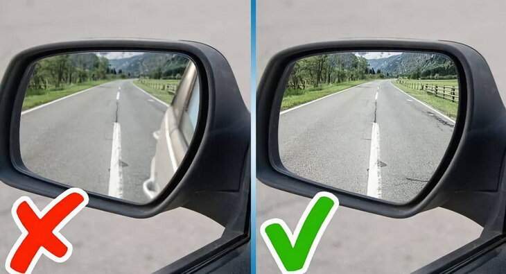 Настраивание зеркал заднего вида с первого взгляда очень простое занятие, однако, в регулировке ошибаются даже профи. Постараемся разъяснить для наших читателей данную процедуру в этой статье. Первым делом водителю нужно правильно сесть — пятая точка полностью на сиденье, спина прижата, а голова — нет, обе руки держат руль, чуть согнуты, ноги вытянуты, слегка согнуты в колене. В последующем не стоит менять своего положения в кресле, так как все настройки собьются. Теперь собственно перейдём к процедуре настройки. Зеркала заднего вида на автомобиле следует настраивать так, чтобы водитель видел в отражении часть своего автомобиля, асфальт и немного того, что над ним. При этом автомобилист не должен крутить головой, приближаться к зеркалу или наклоняться — в левое он смотрит глазами, почти без поворота головы, в правое — слегка повернув голову. При настройке левого бокового зеркала необходимо сначала отрегулировать зеркало в горизонтальной плоскости. В его правой стороне должен быть