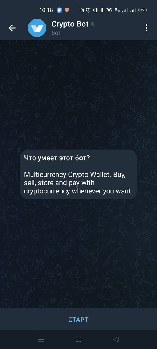 Одним из самых простых способов купить криптовалюту в России - использование телеграм-ботов. Покупка и продажа криптовалюты через телеграм имеет как преимущества, так и недостатки. Преимущества: Недостатки: Важно: здесь стоит почитать про безопасность сделок с криптой Начнем, например, с CryptoBot. CryptoBot - популярный бот, позволяющий анонимно и безопасно торговать Toncoin (монеты Ton)и другими криптовалютами (BTC, BNB, USDT). Использует более 10 платежных методов, в том числе и переводы на карты российских банков (Сбер, Тинькофф, Альфа и других). Бот выступает как гарант безопасности и биржа, а все сделки заключаются между людьми. Ссылка на обменник: https://t.me/CryptoBot?start=r-399940-market (открывается в Telegram) Важно: обратите внимание на правильный адрес бота. Единственный верный юзернейм - @CryptoBot. После перехода по ссылке, жмем старт, бот запустится. Попадаем на главную страницу. С главной страницы можем перейти в Настройки. Там можно изменить язык бота и валют