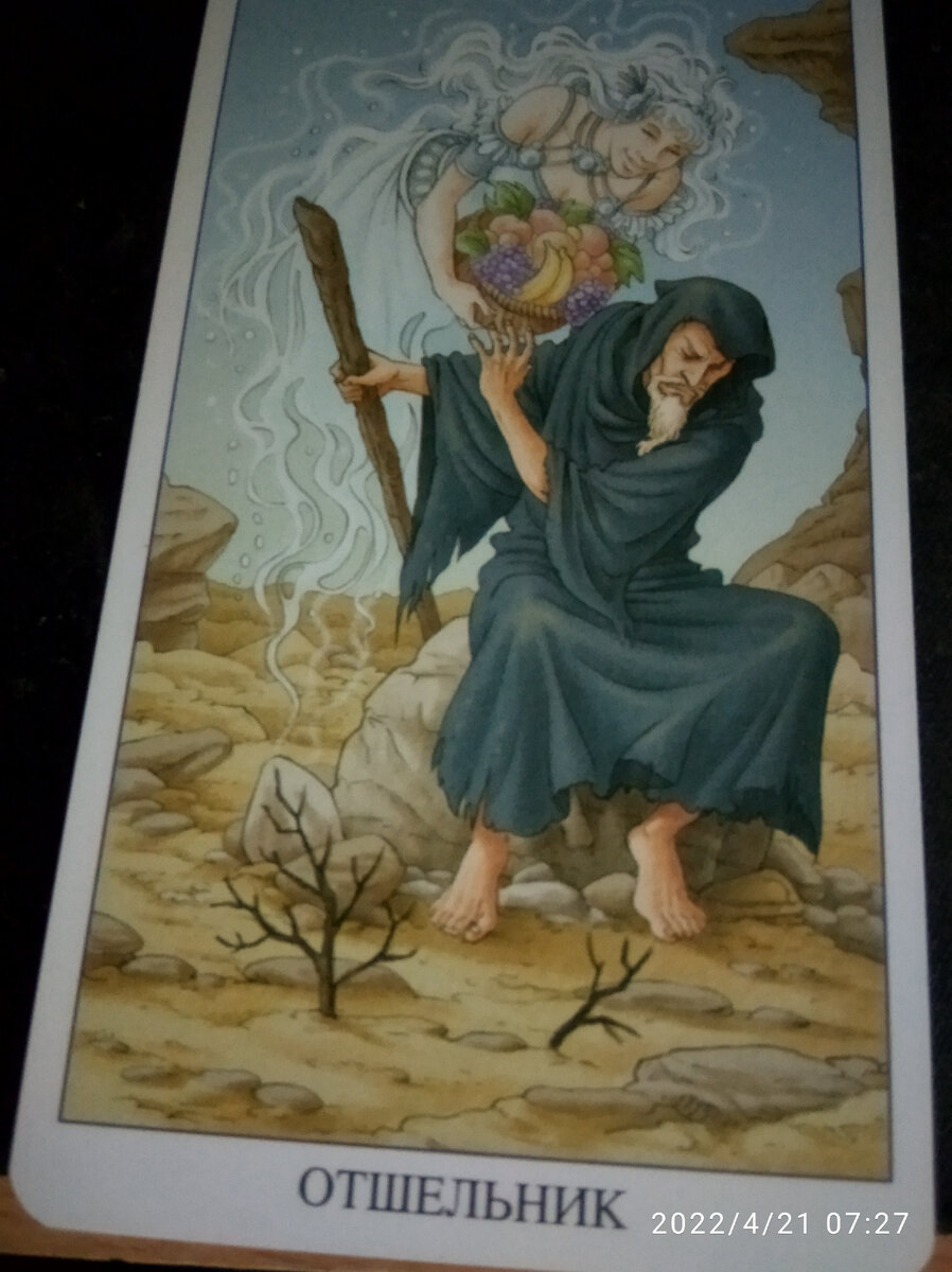 Сегодня выпала Отшельник, видите старика который отбивается от феи которая предлагает ему отведать фрукты и ягоды из своей корзины,видимо он думает что она навязывает ему свою помощь или за угощение надо будет платить. Возможно что сегодня нужно подумать над вашей жизни и что - то в ней изменить, видно пришла пора задуматься о самом важном в вашей жизни,многое наверное было упущено в погоне за приходящими удовольствиями. Вероятно надо будет подготовиться к приближающийся старости , подумать о предстоящем выходе на пенсию ,ведь старость уже на подходе. Может быть следует уделить чуточку внимания и заботы своим пожилым родителям или просто вспомнить о том что они живут рядом с вами и им одиноко без вас.