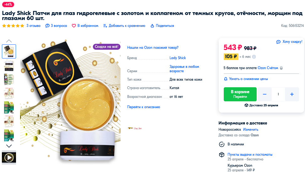 Вот и пошли первые отзывы! И мне очень приятно, что они положительные! Это значит, что гидрогелевые патчи Lady Shick пришлись по душе покупателю. Косметические патчи — это гидрогелевые полоски, имеющие форму полумесяца, которые крепятся под глаза или на любую другую область лица. Говоря простым языком, это точечная маска, призванная увлажнить кожу, избавив её обладательницу от отёчности, мелких морщин или даже кругов под глазами. Название этого средства позаимствовано у компьютерщиков, где патч представляет собой определённую информацию, необходимую для обновления и корректирования данных в файлах. Производителям продуктов по уходу за кожей лица понравилась аналогия, и вот уже косметические патчи штурмуют рынки. И мои патчи не исключение. Данная ниша очень конкурентна. Но всё-таки решила начать именно с патчей по уходу за кожей лица. С производителем был оговорен состав данных гидрогелевых патчей. И здесьь сказалось мое медицинское образование и знание процесса старения кожи (ск