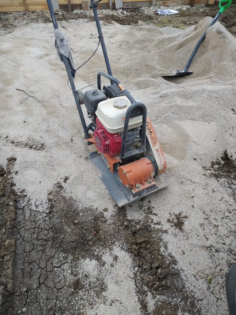 Здравствуйте! Все готово к утрамбовыванию грунта. Такое вот чудо в Новокузнецке у нас есть свое. Здесь пришлось брать в аренду. Благо наверху, тут же в Парусе есть магазин строительный, там можно и такой аппарат взять. Тридцать тысяч в залог, полторы тысячи в сутки. Грузи и забирай, или за дополнительную плату привезут на участок и заберут. Мы забрали сами, ребята помогли загрузить в Митсубиси. На все про все ушло часа три, площадь будущего фундамента восемьдесят пять квадратов, толщина подсыпки в среднем двадцать сантиметров. После ночного дождя даже не стал дополнительно проливать водой. Трамбовка сработала как надо. Жена сначала, да мы бы сами день бы тут попрыгали, и утрамбовали. А как увидела результат после трамбовки, говорит,да, мы с бабушкой тут две недели минимум до такого состояния прыгали. Так называемый Крымский отсев очень хорошо трамбуется, не асфальт конечно и не бетон. Но абсолютно не продавливается подо мной. А вот парковку, на первом доме, отсыпанную