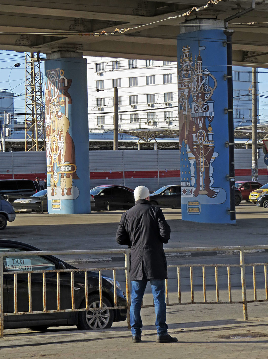 На утреннем вокзале Нижнего Новгорода открыт был только "БургерКинг", который наложил на россиян санкции весьма изощрённым образом - еда в нём мало того подорожала раза в полтора, так ещё и стала тошнотворной. Артём обнаружил, что на такси до места ехать 3 минуты. Избыток времени да солнечная погода и вовсе навели на мысли, что ни к чему нам такси. Единогласно наш отряд решил пройтись пешком от вокзала до цели. Над станцией с длинным названием "Нижний Новгород - Московский" сплетён целый лабиринт мостов, открытых на рубеже 2000-2010-х и плавно переходящих в мосты через Оку. Их опоры интересны муралами: Мы пошли по Московскому шоссе, пешеходным дублёром которого служит симпатичный бульвар: Между промзоной и многоэтажками - зооскульптуры с модным дизайном: Словно идущие на поклон к маленькому памятнику Жуле и Толстушке (2021) - так звали двух дворняжек, стерилизованных и абсолютно безобидных, которые жили в этом сквере и никому не мешали, пока кто-то их не отравил. У станции метро "Кана