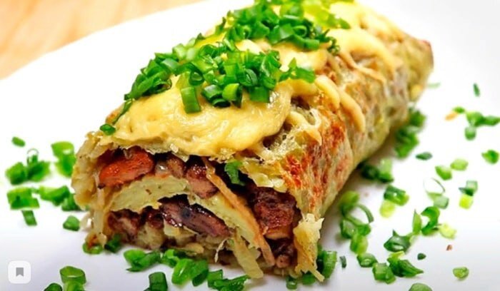 Картофельный рулет с грибами Ингредиенты: Картофель – 700 г Лук репчатый – 1 шт. Грибы лесные – 350 г Яйца – 2 шт. Сыр – 30 г Перья лука – 1 пучок Соль, перец – по вкусу Подсолнечное масло – 3 ст. л. Приготовление: Возьмите две упаковки замороженных грибов по 300 грамм. На выходе после размораживания получается 350 грамм. Грибы поджарить на подсолнечном масле, добавить нарезанный репчатый лук. Добавить соль и черный перец по вкусу. Картофель натереть на терке, добавить 2 яйца, соль и черный перец по вкусу. Все перемешать. Противень застелить пергаментной бумагой. Можно смазать его подсолнечным маслом, чтобы рулет лучше снимался с пергамента. Распределить по нему картофель прямоугольником размером примерно 30 на 40 см. Запекать в духовке, разогретой до 200 градусов, примерно 30 минут до готовности. Готовый картофельный рулет снять с пергамента. Далее, на картофельный рулет выкладываем начинку из грибов и распределяем ее по всей поверхности. Сворачиваем в рулет, сверху посыпаем терты