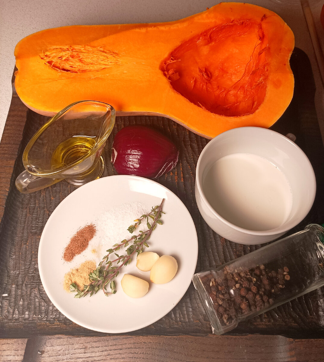 Приветствую. Сегодня поделюсь рецептом замечательного крем супа из тыквы. Супчик получается легким и ароматным. Готовится такой суп легко и быстро. Единственная сложность может заключаться в том, что нам потребуется блендер. Нам понадобится: - тыква - половинка большой или 1 маленькая - половинка красного лука - оливковое масло 1 ст. ложка - чеснок 3 зубка - соль 0,5 ч. ложки - мускатный орех 0,5 ч. ложки - молотый имбирь 0,5 ч. ложки - свежемолотый черный перец - сливки 1 чашка - белый хлеб для гренок (или можно взять уже готовые гренки, которые продаются в магазине) - тимьян 2 веточки (можно обойтись без него, но с ним суп будет более пряным) 1. Тыкву разрежем пополам и ложкой вынем семечки вместе с частью мякоти, которая легко отделяется. Затем счистим жесткую корку. Можно воспользоваться овощечисткой или ножом. Порежем очищенную тыкву на кубики примерно по 4 см. 2. Тыкву кладем в кастрюлю, добавляем веточку тимьяна и залив водой ставим на сильный огонь вариться до мягкости. Провери