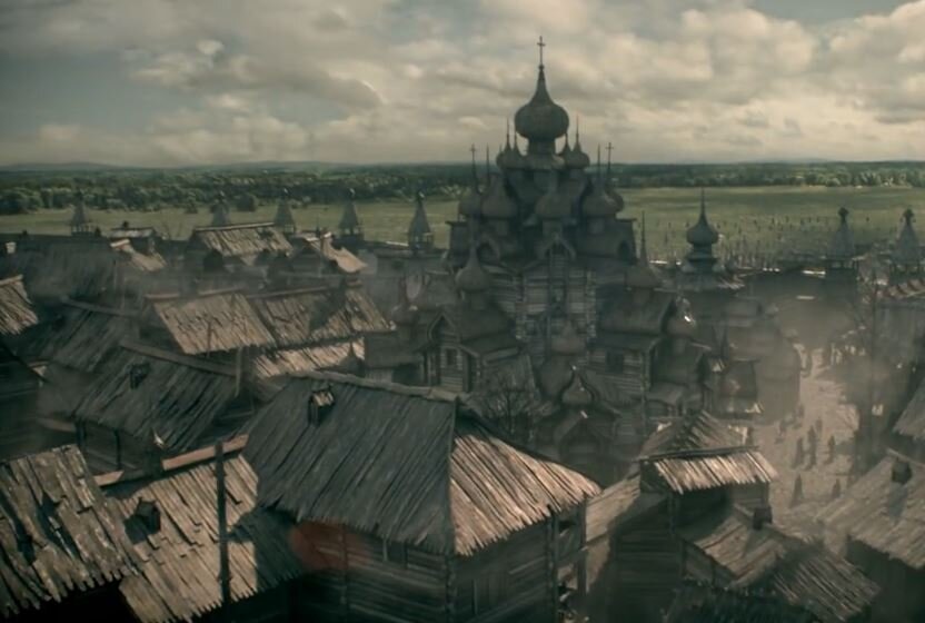 Над "мумбайскими" трущобами из .... и палок возвышается нечто, откуда правит князь Олег, то ли храм Василия Блаженного, судя по башенкам с крестами, то ли княжий замок. Странно, но танцующих под дудку медведей не обнаружено, зато зимой русы катаются на коньках и летают на воздушном шаре.