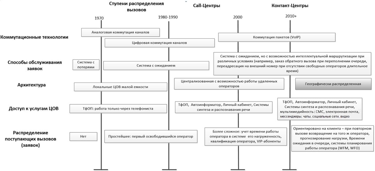 С момента зарождения идеи о необходимости существования системы для обработки поступающих вызовов до контакт-центра прошло почти полвека. История развития центров обслуживания вызовов (ЦОВ) в разрезе различных аспектов отражена на Рисунке 1. Очевидно, что за последние полвека ЦОВ претерпел существенные изменения как с точки зрения абонента, его использующего, так и со стороны внутренней структуры.
