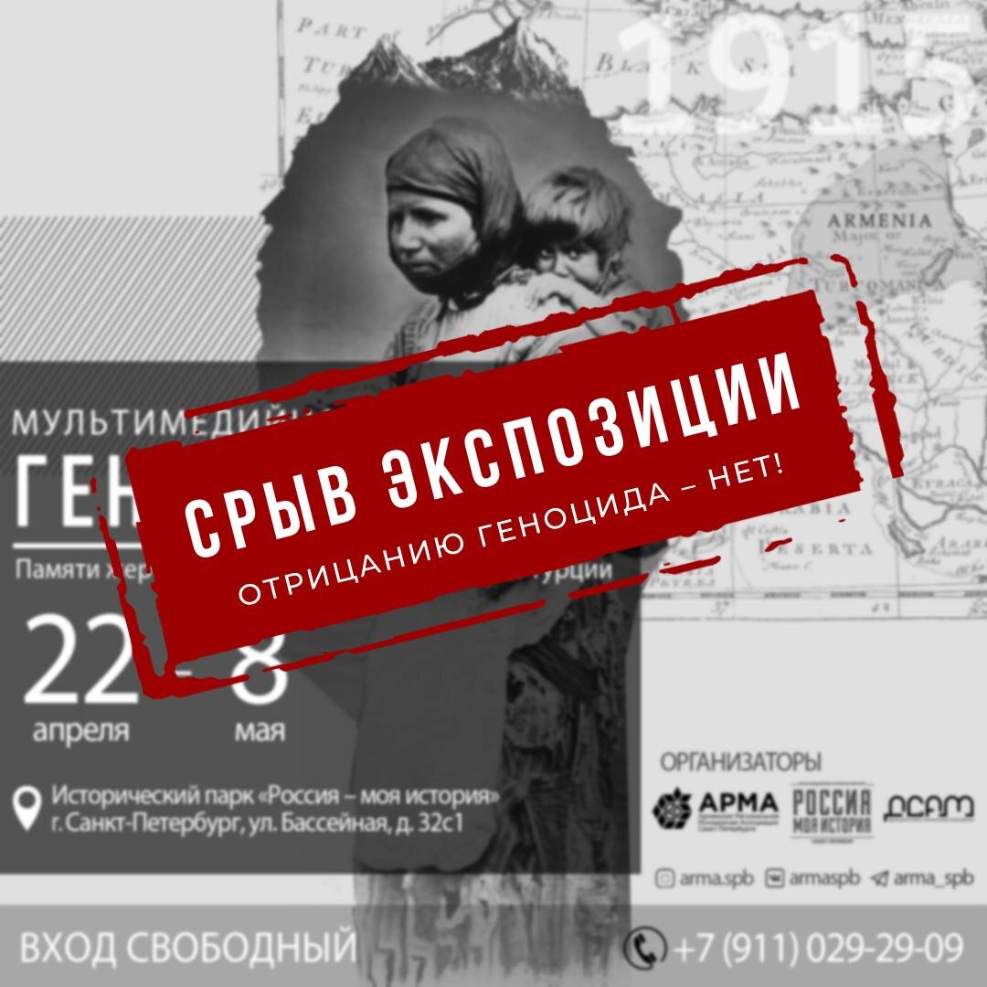 В Санкт-Петербурге отменили запланированную 20-30 апреля выставку "Геноциду - НЕТ!", посвященную годовщине Геноцида армян. Об этом сообщила Армянская Региональная Молодёжная Ассоциация , которая занималась организацией выставки совместно с другими армянскими общественными организациями. Важно отметить, что выставка была заранее согласована с администрацией города, и было получено разрешение на ее проведение, однако без разъяснения причин разрешение было отозвано. Подобное развитие событий неудивительно, учитывая огромное влияние азербайджанского лобби в Санкт-Петербурге. Его представителем является ни много ни мало сам губернатор Александр Беглов, родом из солнечного Баку. Примечательно, что его предшественник Георгий Полтавченко также являлся выходцем из Баку. За годы их правления Санкт-Петербург превратился в “филиал” Азербайджана, где азербайджанские интересы ставятся даже превыше российских. На сегодняшний день «АРМА» предпринимает усилия для проведения выставки в другом месте,