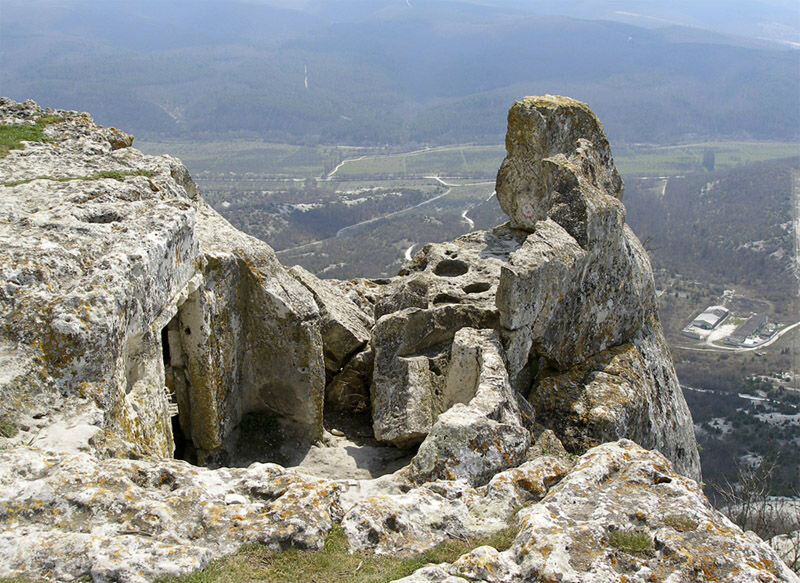 Невелика площадь этого живописного останца, она не превышает 1 га, но здесь сосредоточено около 250 искусственных пещер. Некоторые из них располагаются в несколько ярусов. Нередко встречаются комплексы пещер, состоящие из двух, трех и четырех помещений. В верхние пещеры можно попасть только с поверхности плато. На западной стороне это были, в основном, боевые казематы. Их амбразуры, выходящие в обрыв, предназначались для стрельбы из лука и сбрасывания камней. В северо–восточной части плато размещается вырубленный в скале храм. По своим архитектурным особенностям он необычен для средневековой Таврики. Это сравнительно большая пещерная церковь: в длину – более 11 м, в ширину – от 4,2 до 5,4 м. Она вытянута не по оси, направленной к алтарю, как это было обычно принято, а по оси север–юг. Алтарная преграда сильно выдвинута вперед и занимает почти всю центральную часть помещения. Такого рода постройки известны на территории Малой Азии, входившей в состав Византийской империи. Они возникали