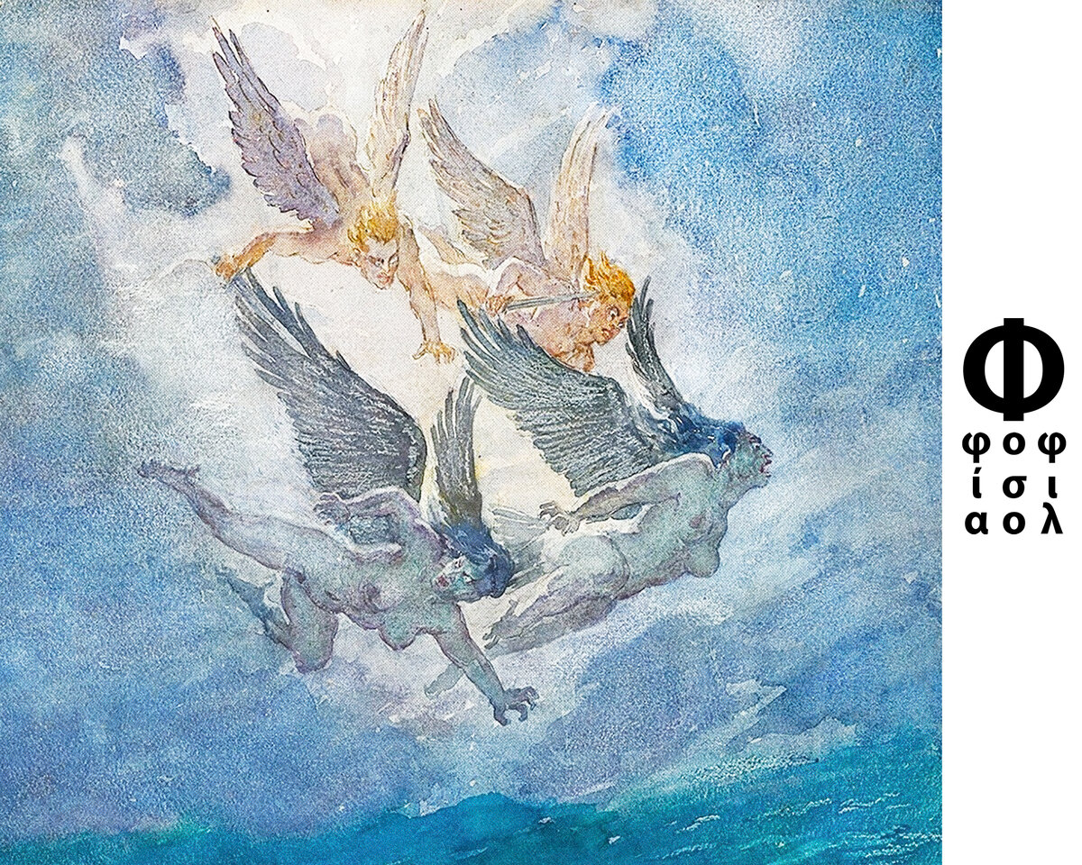 Вашему вниманию представляется работа «Ветер и Фурии» («Wind and the Furies») австралийского художника Нормана Линдсея (Norman Lindsay). Не упомнить сюжета, в котором какие-либо ветра преследовали древнеримских богинь мести и ненависти Фурий (др.-греч. Эринии). Однако сия работа мгновенно отсылает к истории о том, как Зет и Калаид (крылатые сыновья бога ветра Борея) однажды гонялись за Гарпиями. Дело было так. Жил-был слепой прорицатель Финей. Его боги лишили зрения в наказание за то, что он по наущению мачехи ослепил своих собственных детей. Другие поговаривают, за то, что он указал детям Фрикса морской путь из Колхиды в Элладу. Как бы там ни было, беда Финею пришла не одна. Боги наслали на него Гарпий, отвратительных крылатых существ женского пола. «И каждый раз, как для Финея накрывали стол, они стремглав спускались с неба и похищали большую часть еды, а то немногое, что оставалось на столе, заражали таким зловонием, что есть это было невозможно». Однажды аргонавты были у Финея и пр