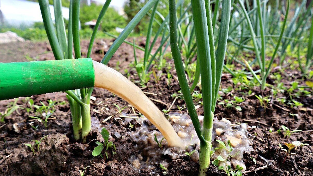 Из азотных удобрений весной используют мочевину (25г на 10л), аналогичного эффекта аммиачную селитру (15г на 10л) или целевую заправку от Агриколы серии «Для лука и чеснока». Из натуральных подкормок подходят коровяк (1к10 с водой), куриный помет (1к20 с водой) и зеленый чай из сорняков. Последний состав получают путем недельного настаивания сорных трав в воде по расчету 1к20.