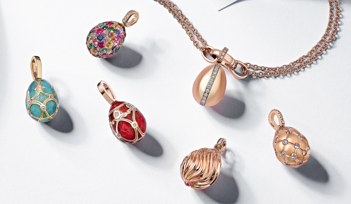 Ассортимент современных украшений Fabergé включает в себя элегантные и игривые подвески-яйца для браслетов и колье в виде крупных золотых цепочек. Подвески Treillage с тактильной стеганой поверхностью вдохновлены созданным в 1892 году бриллиантовым яйцом Trellis с узором «подушка». Золотой с эмалью кулон "Царскосельский дворец" из коллекции Heritage раскрывается, показывая спрятанную внутри золотую курочку.