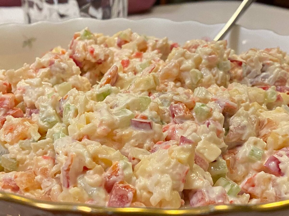🔸Рыба( сёмга или форель) слабо солёная или подкопчёная 300гр 🔸Палочки крабовые 400-500 гр 🔸Сыр(гауда, тильзиттер, сметанковый, российский) 150-200гр 🔸Перец сладкий, красный 2-3 шт. 🔸Сельдерей черешковый 6-8 стеблей 🔸Майонез Время приготовления: 15-20 мин. 👩🏼🍳 1️⃣ Все твердые ингредиенты мелко шинкуем. 2️⃣ Смешиваем. Добавляем майонез, по вкусу.