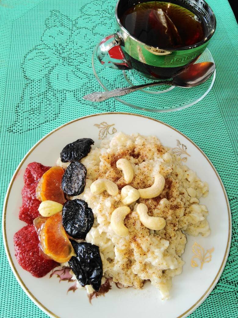 Ингредиенты: овсянки или хлопьев, воды, яблока, Грецкие орехи , Кешью , Сухофрукты, ягоды, варенье для подачи , сахара, соли