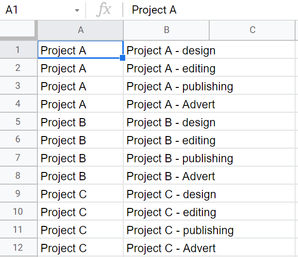Привет. Недавно я написал о зависимых выпадающих списках в Эксель. Там эта задача решается достаточно просто с помощью функции ДВССЫЛ (INDIRECT) в валидации данных. К сожалению, в гугл-таблицах нельзя использовать формулу при провреке данных, можно указать только диапазон или список значений (если идет речь о значениях из списка). Все статьи про зависимые списки в гугл-таблицах, которые я видел, предлагают только один подход: скрипт, который подвязывается на редактирование (onEdit(e)), который определяет в зависимый список и назначает его для валидации данных в соседней ячейке. Мне этот способ не нравится по нескольким причинам: Решение для гугл-таблиц без скрипта Ноу-хау моего метода в создании динамических списков для каждой зависимой строки. Создадим лист "Данные", в котором перечислем все проекты: Создадим лист, на котором мы будем делать динамические списки, назовем его "Рабочий лист". Сначала сделаем основной список. В ячейке A1 разместим формулу: =transpose(UNIQUE('Данные'!A:A)