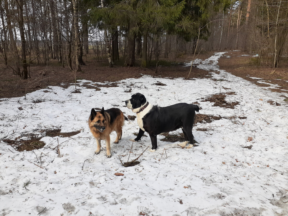 Собак у нас много. Выйдешь гулять, обязательно встретишь кого-нибудь. Черно-белая алабай Дива - Кирина подружка. Они познакомились еще щенками. Раньше они хорошо играли вдвоем, а сейчас обе повзрослели, чуть пробегутся и все. Пошли в лес. Снег еще лежит. Даже на открытом пространстве еще есть поляны снега. Снег тает, образуются любимые Кирой лужи :) На опушке леса (солнечная сторона) снега нет, всходит зеленая травка. Но Кира, почему-то, ест сухую траву. Зеленеет черника. И брусника. Нет снега на поле. После прогулки и обеда - тихий час. В кошачьей лежанке :) Еще немного и снега не будет совсем. Идут дожди, становится все теплее. Весна... :)