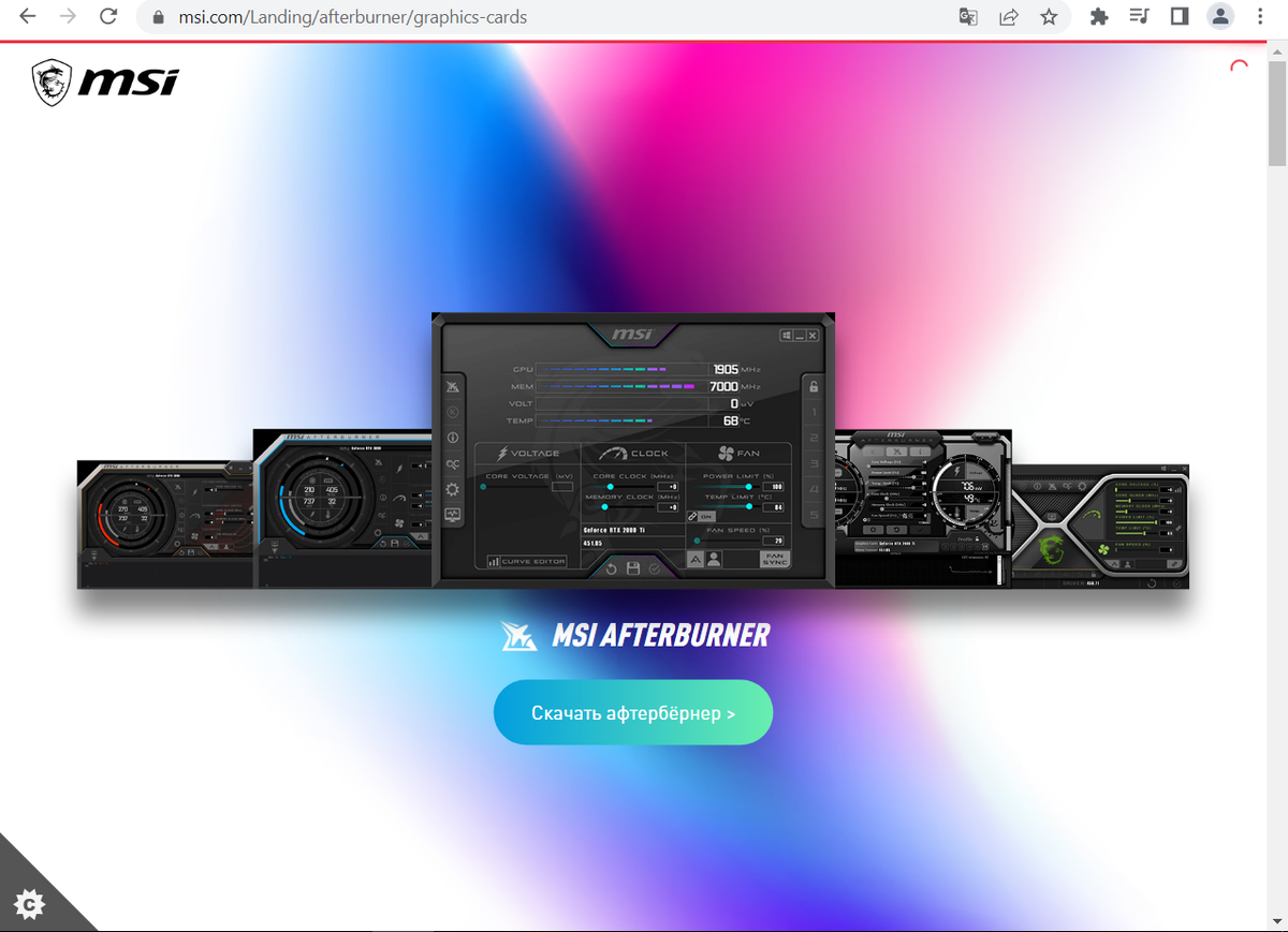 Что такое разгон и зачем он нужен? Разгон - повышение производительности (мощности) пк за счет изменения технических параметров. Повышение некоторых параметров видеокарты могут немного поднять производительность вашей системы. В случае с разгоном видеокарты нам важны такие параметры как : Частота ядра и частота памяти. Статья посвящена безопасному разгону (без повышения напряжения и смены штатной системы охлаждения), такой разгон можно осуществить в домашних условиях без танцев с бубном. Первый шаг, программы : Разгон видеокарты осуществляется с помощью стороних утилит. Можно использовать любую удобную вам утилиту, самые распространённые : MSI Afterburner, GPU-Z, Furmark. MSI Afterburner самая известная, удобная и распространённая утилита, разгон сегодня будет осуществляться с помощью неё. Вы можете использовать любую понравившуюся программу. Скачиваем с официального сайта MSI Afterburner файл и устанавливаем его. После установки и запуска приложения мы видим такое окно : Разгонять м