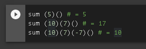 Задача У нас есть цепочка символов. Нужно получить сумму. Например: sum (5)() Получаем 5 sum (10)(7)() Получаем 17 sum (10)(7)(-7)() Получаем 10 Решаем sum - вызываемый объект. Мы будем использовать функцию. В функцию sum() передается аргумент и эта функция возвращает новую функцию. Новая функция может быть вызвана без аргументов (как в примере 1) или с другими аргументами (примеры 2 и 3). Эта функция снова вернет новую функцию. Образуется цепочка. def sum (number): #Функция sum принимает на вход некое число return #Исходя из абзаца выше функция sum должна возвращать функцию. Все функции в Python являются объектами 1-го класса. Следовательно мы можем передавать функции как другие аргументы функции, вернуть функцию в другой функции и назначить функцию другой переменной. Определим эту функцию строчкой выше. Функция будет получать новое число: def sum (number): def new (number2=None): return Обратите внимание, что стандартное значение None, т.к. 2-го аргумента может и не быть (пример 1) Т